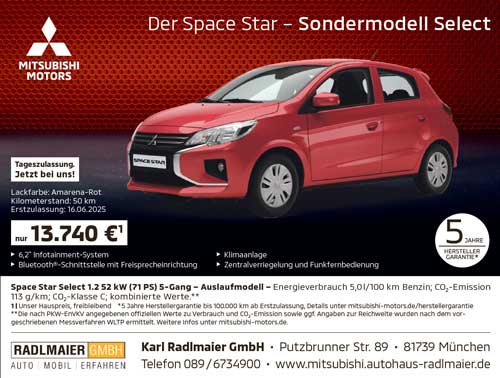 Entdecken Sie den Mitsubishi Space Star Sondermodell „Select“ bei Autohaus Radlmaier – Ihr Experte für Mitsubishi in München.